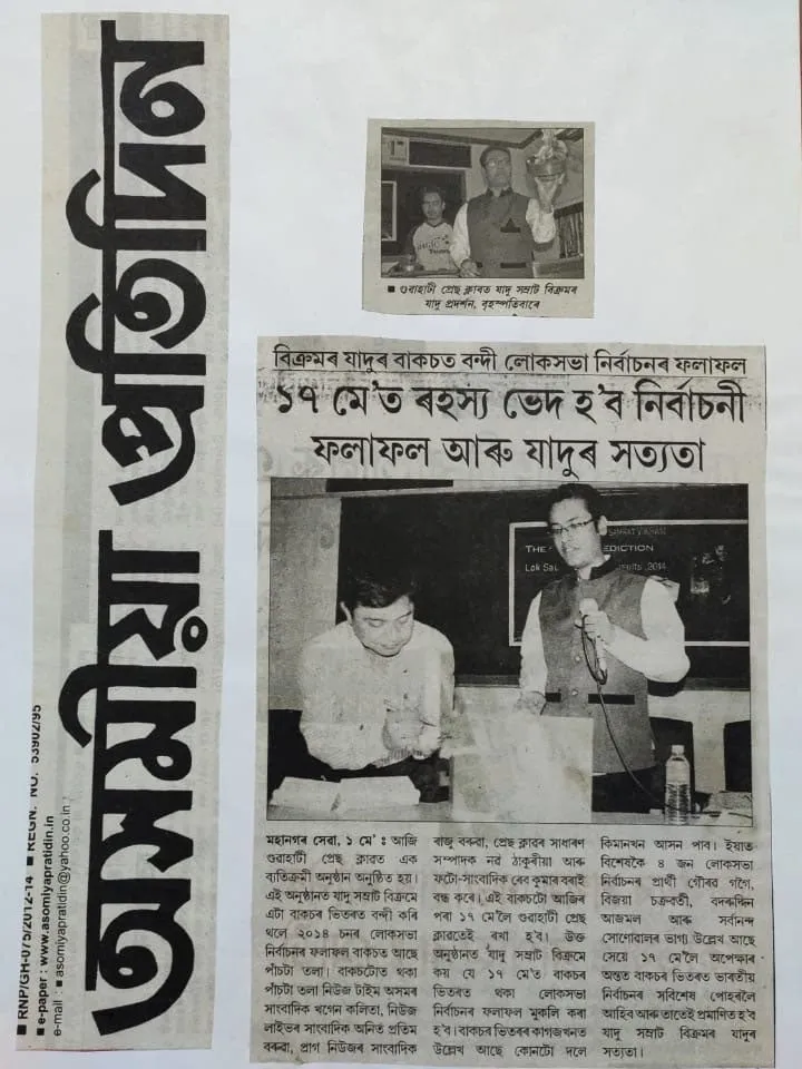 যাদুকৰ বিক্ৰমে ২০১৪চনৰ লোকসভা নিৰ্বাচনৰ ফলাফলৰ সন্দৰ্ভত ভৱিষ্যৎবাণী কৰিছিল। যি ভৱিষ্যৎবাণী ১০০ শতাংশই শুদ্ধ বুলি প্ৰমাণিত হৈছিল। ১ মে', ২০১৪ত তেওঁ নিৰ্বাচনী ফলাফল লিখি বন্ধ কৰি থৈছিল এটা বাকচত।