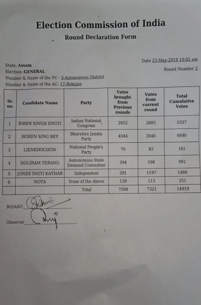- ২য় ৰাউণ্ডৰ অন্তত বিজেপি প্ৰাৰ্থী হৰেণ সিং বে'য়ে মুঠ ভোট লাব কৰিছে ৬৬৯০ টা।
