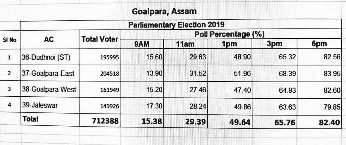 - গোৱালপাৰা জিলাৰ চাৰিটা সমষ্টিৰ পুৱা ৭ বজাৰপৰা বিয়লি ৫ বজালৈকে ভোটদানৰ হাৰ ৮২:৪০ শতাংশ।