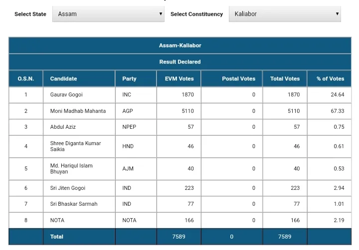 - কলিয়াবৰত অগপ প্ৰাৰ্থী মনি মাধৱ মহন্তই লাভ কৰিছে ৫১১০ টা ভোট।