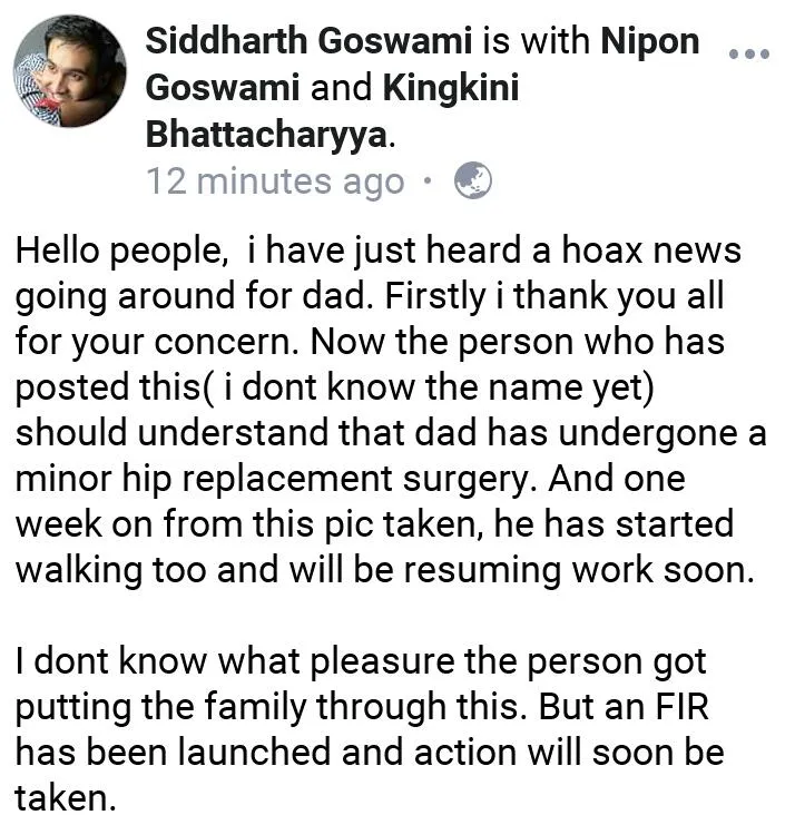 ডিজিটেল ডেস্কঃ যোৱা শুকুৰবাৰে বিশিষ্ট অভিনেতা নিপন গোস্বামীৰ মৃত্যুৰ সন্দৰ্ভত ছচিয়েল মিডিয়াত একাংশ লোকে বিয়পাইছিল উৰাবাতৰি। কিছুদিনৰ পূৰ্বে চিকিৎসালয়ত ভৰ্তি হৈ বৰ্তমান সম্পূৰ্ণৰূপে সুস্থ অভিনেতা গৰাকীক লৈ বিয়পোৱা এনে উৰাবাতৰিক লৈ প্ৰতিক্ৰিয়া প্ৰকাশ কৰিছিল পৰিয়ালেও। নিপন গোস্বামীৰ পুত্ৰই শুকুৰবাৰে নিশা ফেচবুকৰ জৰিয়তে এই কাৰ্যত আক্ষেপ কৰি দুষ্ট চক্ৰৰ বিৰুদ্ধে এজাহাৰ দাখিল কৰাৰ কথাও সদৰি কৰিছিল।