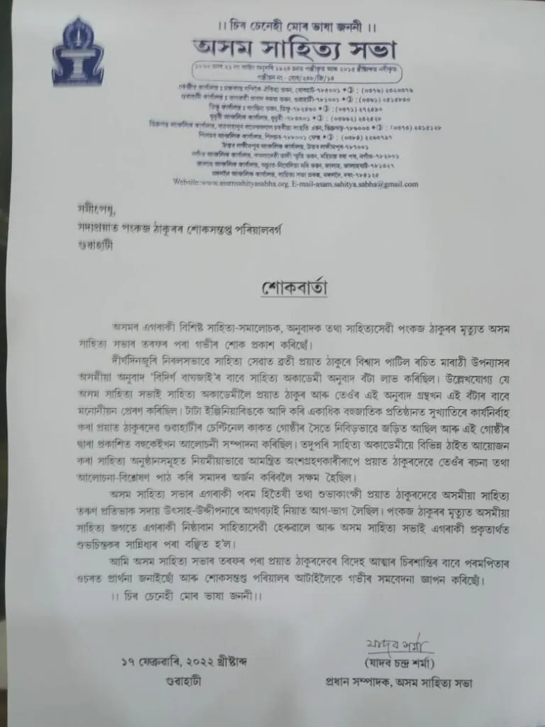 আমি অসম সাহিত্য সভাৰ তৰফৰ পৰা প্ৰয়াত ঠাকুৰদেৱৰ বিদেহ আত্মাৰ চিৰশান্তিৰ বাবে পৰমপিতাৰ ওচৰত প্ৰাৰ্থনা জনাইছোঁ আৰু শোকসন্তপ্ত পৰিয়ালৰ আটাইলৈকে গভীৰ সমবেদনা জ্ঞাপন কৰিছোঁ ।