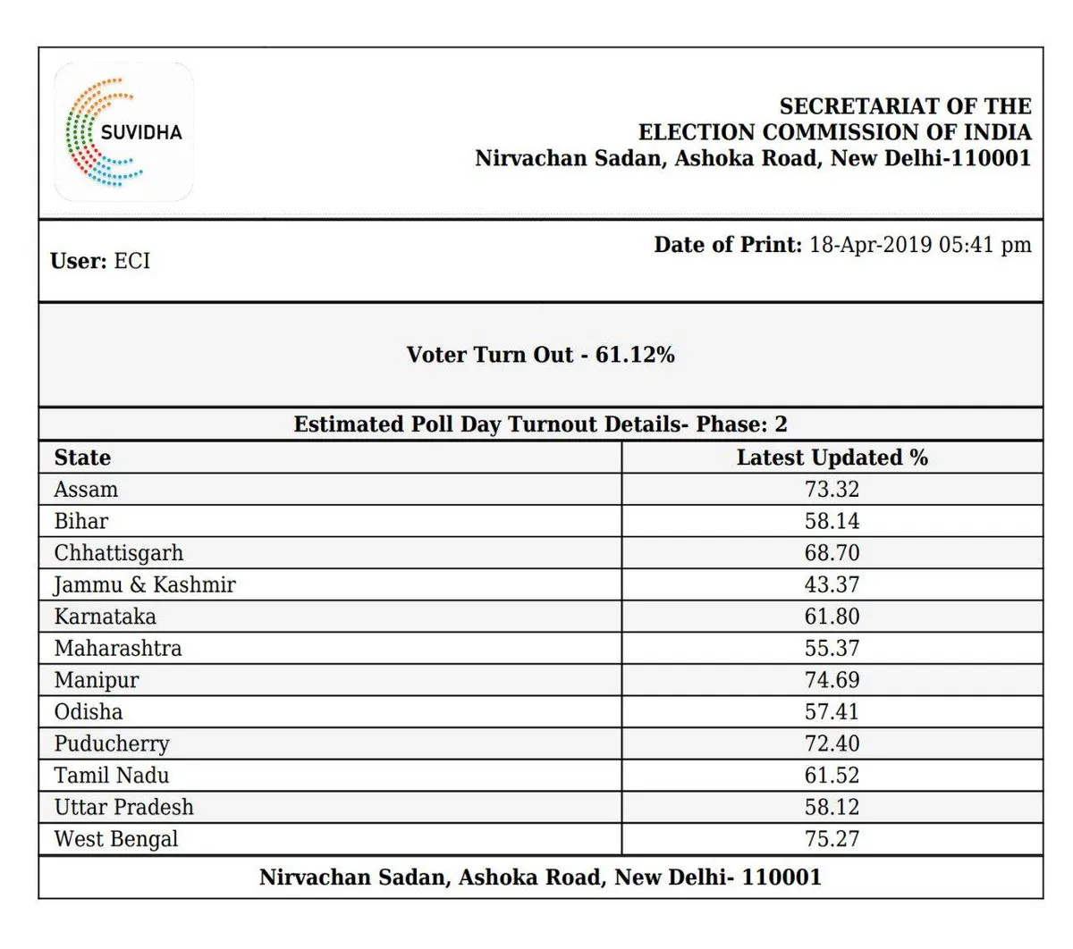 উল্লেখ্য যে, মুঠ ৯ টা পৰ্যায়ত অনুষ্ঠিত ২০১৪ চনৰ লোকসভা নিৰ্বাচনৰ দ্বিতীয় পৰ্যায়ৰ নিৰ্বাচনত সন্ধিয়া ৫ বজা পৰ্যন্ত মুঠ ভোটদানৰ হাৰ আছিল ৬৪.০১ শতাংশ। কিন্তু নিৰ্বাচন আয়োগে সদৰি কৰা তথ্য অনুসৰি ২০১৯ চনৰ লোকসভা নিৰ্বাচনৰ দ্বিতীয় পৰ্যায়ত সন্ধিয়া ৫.৪১ বজালৈকে ভোটগ্ৰহণৰ হাৰ ৬১.১২। অৰ্থাৎ পূৰ্বৰ তুলনাত এইবাৰ ভোটদানৰ হাৰ প্ৰায় ৩ শতাংশ হ্ৰাস পোৱা পৰিলক্ষিত হৈছে।
