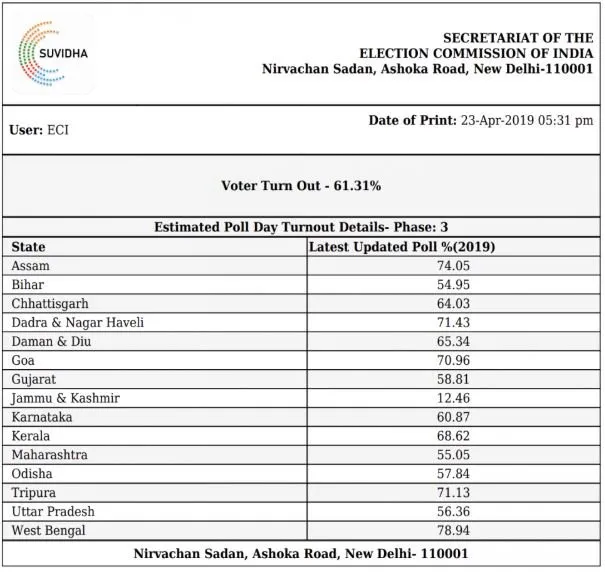 - তৃতীয় পৰ্যায়ত ভোটগ্ৰহণ অনুষ্ঠিত হোৱা অন্য ৰাজ্যৰ ভোটদানৰ হাৰ এনেধৰণৰ-