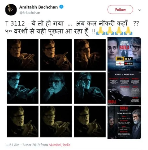 ডিজিটেল ডেস্কঃ অমিতাভ বচ্চনক চাকৰি লাগে। টুইটাৰৰ হেণ্ডেলত বিগ বিয়ে টুইট কৰিছে এই কথা। টি৩১১২ হৈ গ'ল। এতিয়া চাকৰি ক'ত? ৫০ বছৰে সুধি আহিছো এয়া। শুকুৰবাৰে মুক্তি পোৱা 'বদলা' ছবিখনক লৈ এইদৰে প্ৰচাৰ চলাইছে বিগ বিয়ে। ছবিখনত অভিনেতাগৰাকীয়ে জোৰদাৰ অভিনয় কৰিছে। বিগ বিয়ে দিয়া টুইটটো এইটো-