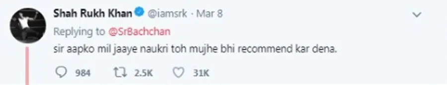 ইয়াৰ প্ৰত্যুত্তৰ দিয়াত বিগ বিয়েও দেৰি নকৰিলে। কিং খানক উত্তৰ দি বিগ বিয়ে লিখিলে- একেলগে কাম কৰাৰ মোৰ তাত এটা উপায় আছে। উল্লেখযোগ্য যে, এই ছবিখনত অমিতাভ বচ্চনে অধিবক্তাৰ চৰিত্ৰ ৰূপায়ন কৰিছে। এই ছবিখনৰ নায়িকা তাপছীৰ সৈতে অমিতাভ বচ্চনে পূৰ্বে 'পিংক'ত অভিনয় কৰিছিল।
