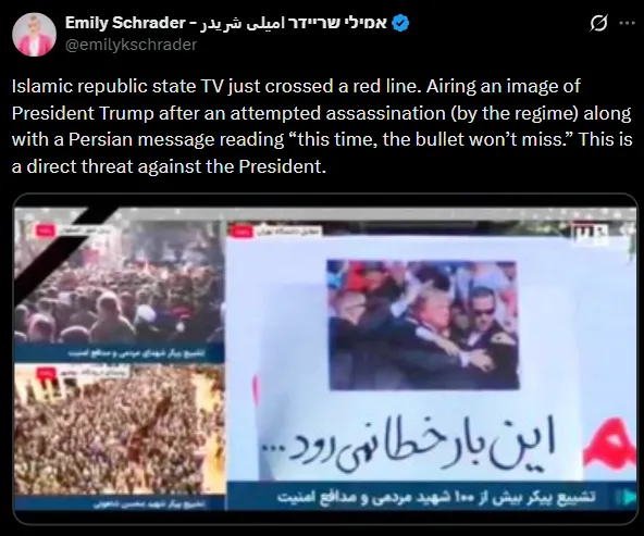 কিন্তু এইবাৰ ইৰাণৰ তৰফৰ পৰাও যেন সকলো সীমা পাৰ কৰি দিয়া হৈছে। ৰাষ্ট্ৰীয় সংবাদমাধ্যমৰ খবৰ অনুসৰি, ইৰাণে এখন ফটোৰ জৰিয়তে আমেৰিকাৰ ৰাষ্ট্ৰপতি ডোনাল্ড ট্ৰাম্পক সকীয়নি প্ৰদান কৰিছে। ২০২৪ত পেন্সিলভেনিয়াত ট্ৰাম্পৰ ওপৰত আক্ৰমণ কৰাৰ এখন ফটো ইৰাণে দেখুৱাইছে। এই ফটোখনত এক ৰেলীত ট্ৰাম্পক গুলীয়াই হত্যা কৰাৰ চেষ্টা চলোৱা হৈছিল। কিন্তু সৌভাগ্যক্ৰমে এই আক্ৰমণত ৰক্ষা পৰে ডোনাল্ড ট্ৰাম্প।