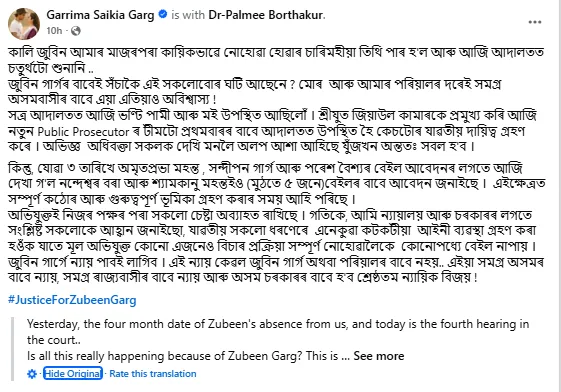 পুনৰ সামাজিক মাধ্যমত জুবিন গাৰ্গৰ পত্নী গৰিমা শইকীয়া গাৰ্গে কৰিছে পোষ্ট। পোষ্টটোত লিখিছে, “কালি জুবিন আমাৰ মাজৰ পৰা কায়িকভাৱে নোহোৱা হোৱাৰ চাৰিমহীয়া তিথি পাৰ হ’ল আৰু শনিবাৰে আদালতত চতুৰ্থটো শুনানি সম্পন্ন হয়। জুবিন গাৰ্গৰ বাবেই সঁচাকৈ এই সকলোবোৰ ঘটি আছেনে ? মোৰ আৰু আমাৰ পৰিয়ালৰ দৰেই সমগ্ৰ অসমবাসীৰ বাবে এয়া এতিয়াও অবিশ্বাস্য ! সত্ৰ আদালতত ভণ্টি পামী আৰু মই উপস্থিত আছিলোঁ । শ্ৰীযুত জিয়াউল কামাৰকে প্ৰমুখ্য কৰি নতুন Public Prosecutor ৰ টীমটো প্ৰথমবাৰৰ বাবে আদালতত উপস্থিত হৈ কেচটোৰ যাৱতীয় দায়িত্ব গ্ৰহণ কৰে । অভিজ্ঞ অধিবক্তা সকলক দেখি মনলৈ অলপ আশা আহিছে যুঁজখন অন্ততঃ সবল হ’ব । কিন্তু, যোৱা ৩ তাৰিখে অমৃতপ্ৰভা মহন্ত , সন্দীপন গাৰ্গ আৰু পৰেশ বৈশ্যৰ বেইল আবেদনৰ লগতে দেখা গ’ল নন্দেশ্বৰ বৰা আৰু শ্যামকানু মহন্তইও (মুঠতে ৫ জনে)বেইলৰ বাবে আবেদন জনাইছে । এইক্ষেত্ৰত সম্পূৰ্ণ কঠোৰ আৰু গুৰুত্বপূৰ্ণ ভূমিকা গ্ৰহণ কৰাৰ সময় আহি পৰিছে ।