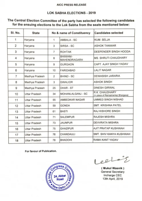 - কংগ্ৰেছে প্ৰকাশ কৰিলে আৰু এখন প্ৰাৰ্থীৰ তালিকা।