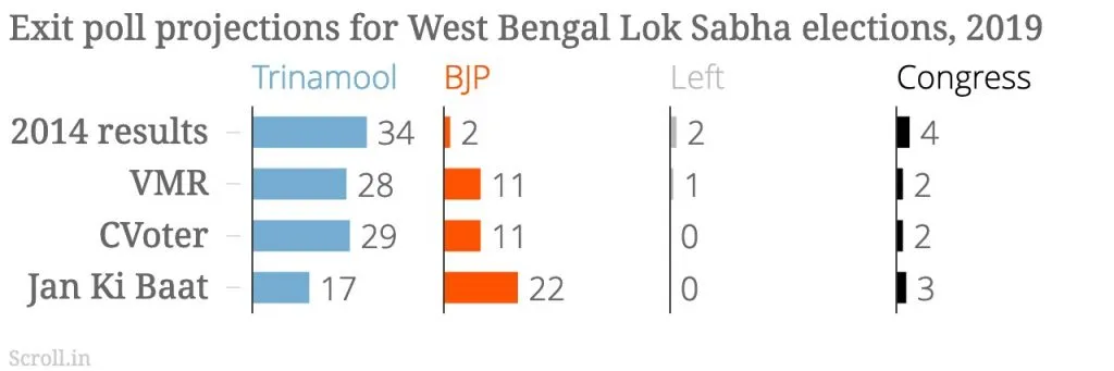 ৪২ খন আসন থকা পশ্চিম বংগত ২০১৪ চনত তৃণমূলে ৩৪ খন, বিজেপিয়ে ২ খন, বাও দলে ২ খন আৰু কংগ্ৰেছে ৪ খন আসন লাভ কৰিছিল। এক্সিট প'লৰ মতে, এইবাৰ বিজেপিয়ে ভাল ফলাফল লাভ কৰিব ৰাজ্যখনত। ভিএমআৰৰ মতে, পশ্চিম বংগত তৃণমূলে ২৮ খন, বিজেপিয়ে ১১ খন আৰু কংগ্ৰেছে ২ খন আসন লাভ কৰিব। চি ভোটাৰেও বিজেপিক ১১ খন, তৃণমূলে ২৯ খন আৰু কংগ্ৰেছে ২ খন আসন লাভ কৰিব বুলি এক্সিট প'লত উল্লেখ কৰিছে।