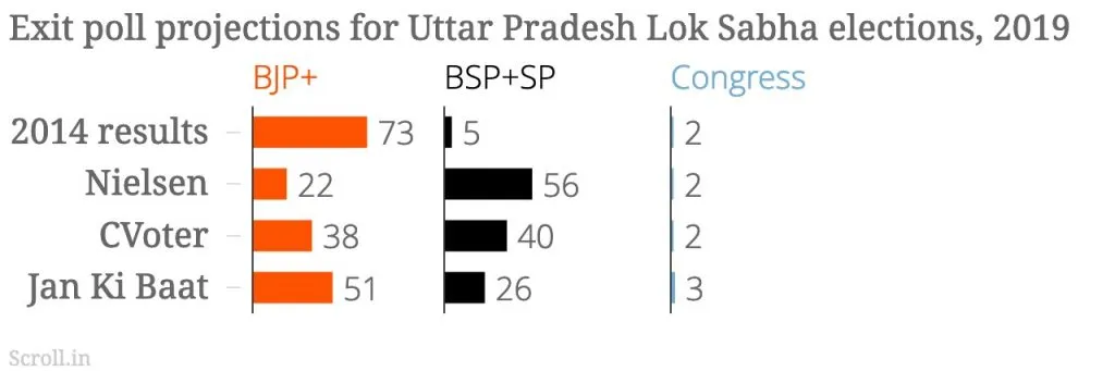 এইবাৰ উত্তৰ প্ৰদেশৰ এক্সিট প'লত বিজেপিৰ আসনৰ সংখ্যা হ্ৰাস পাব বুলি কোৱা হৈছে। NIELSONৰ মতে ৰাজ্যখনত বিজেপি মিত্ৰজোঁটে ২২ খন, এছপি-বিএছপিয়ে ৫৬ খন আৰু কংগ্ৰেছে ২ খন আসন লাভ কৰিব।