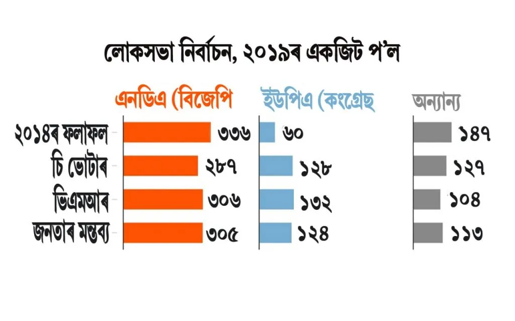 এইবাৰ লোকসভা নিৰ্বাচনৰ অন্তত প্ৰকাশ পোৱা এক্সিট প'লৰ সমীক্ষাই পৰৱৰ্তী চৰকাৰ কাৰ হ'ব তাৰ এক আভাষ দিছে। হয়তো এক্সিট প'লৰ মতে পুনৰবাৰ প্ৰধানমন্ত্ৰী হ'ব পাৰে নৰেন্দ্ৰ মোডী। কিন্তু এই কথা মনত ৰখা ভাল- এয়া একজিট প'ল হে। চূড়ান্ত ফলাফলত ইফাল সিফাল হোৱাটো স্বাভাৱিক।